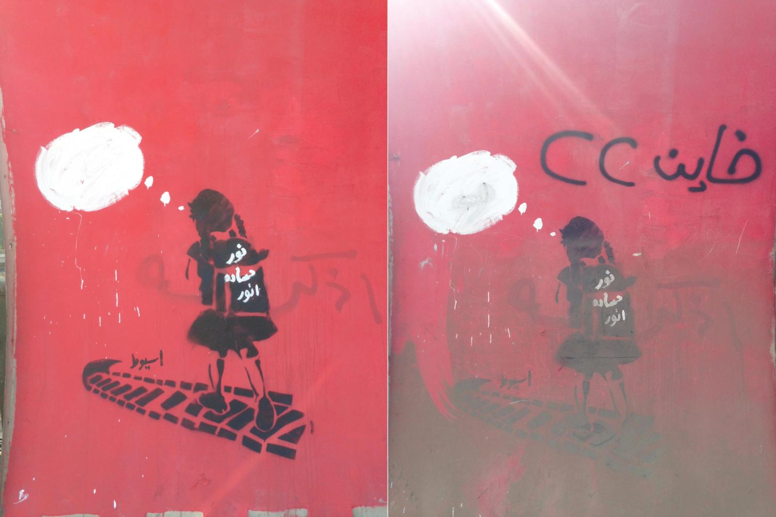 Figure 5. Inside bubble (in black by artist): Not yet (covered in white). Cairo, Egypt. Line 1, sprayed in red: CC is a traitor and a murderer. Line 2, sprayed in green: Remember Allah.