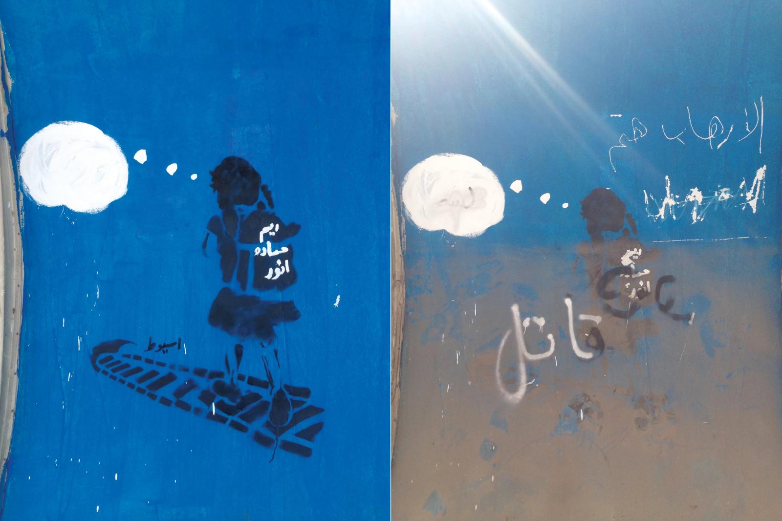 Figure 10. Inside bubble (in black by artist): Not yet (covered in white). Cairo, Egypt. Line 1, sprayed and engraved in paint: They (meaning the Muslim Brotherhood) are the terrorists. Line 2, sprayed in black and white: CC is a murderer.
