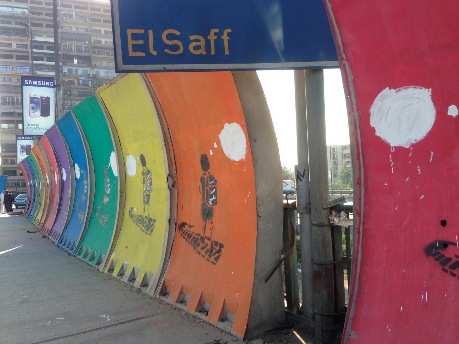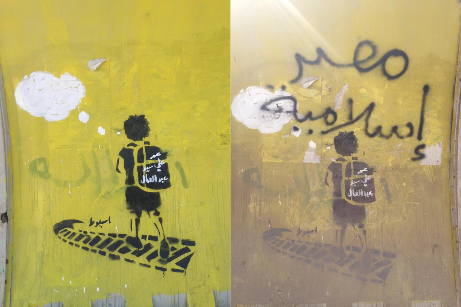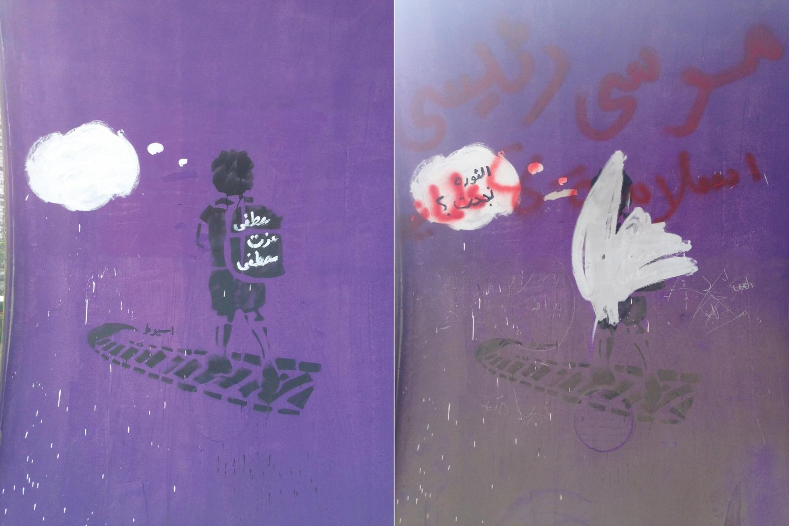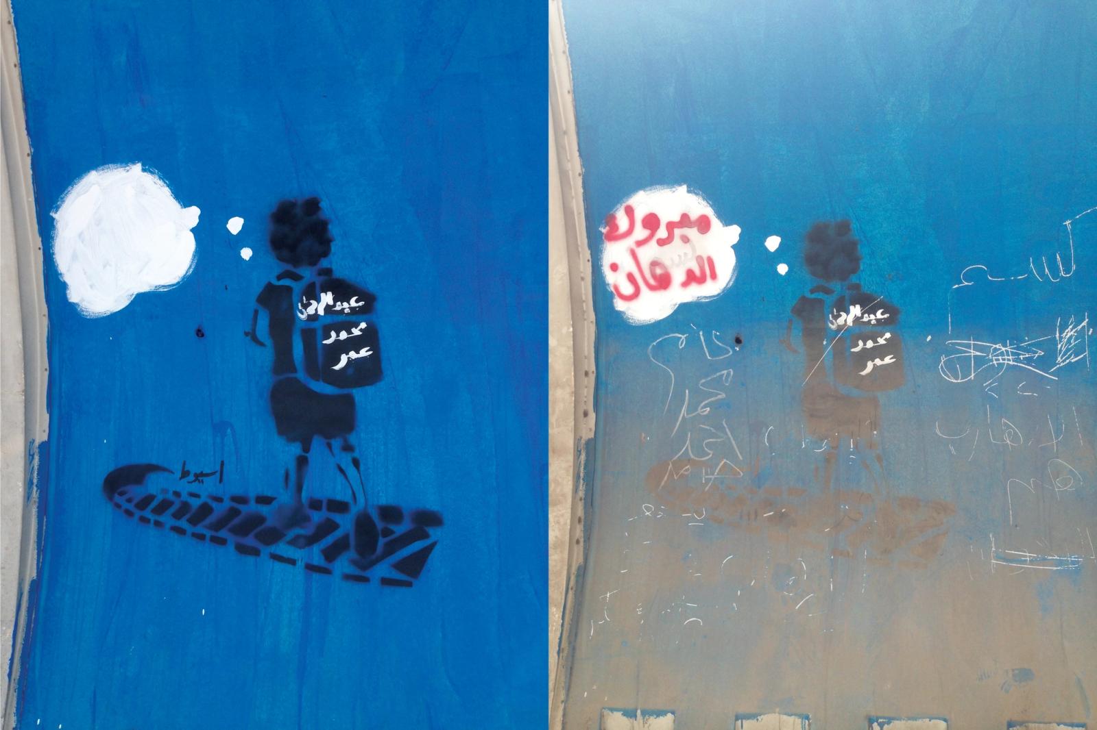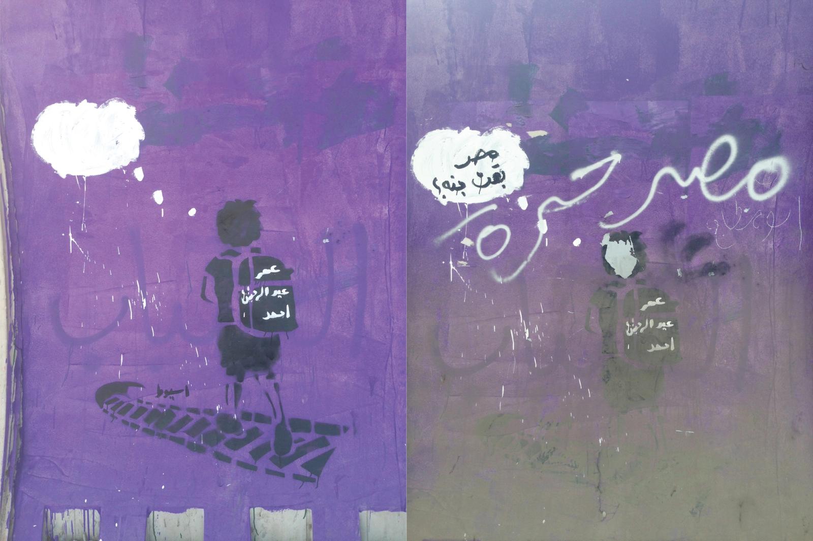 On January 25, 2013, the children of Assiut were painted on the walls of Cairo. Some of them appear alone to ask a question, like ‘I wish I grew up to be a princess’ or ‘I could have grown up to be a policeman or a scientist’. A sister calms her brother with a lullaby near a bus stop. The lullaby reads, ‘Mother is on the way’ and her brother asks her, ‘Soon?’ A little girl states that she has died and gone to heaven but they (meaning those responsible) are all going to hell.