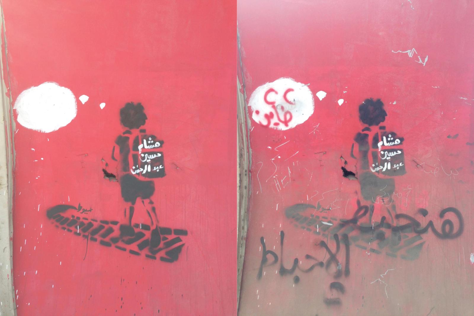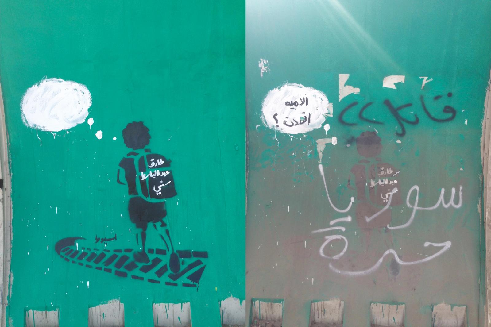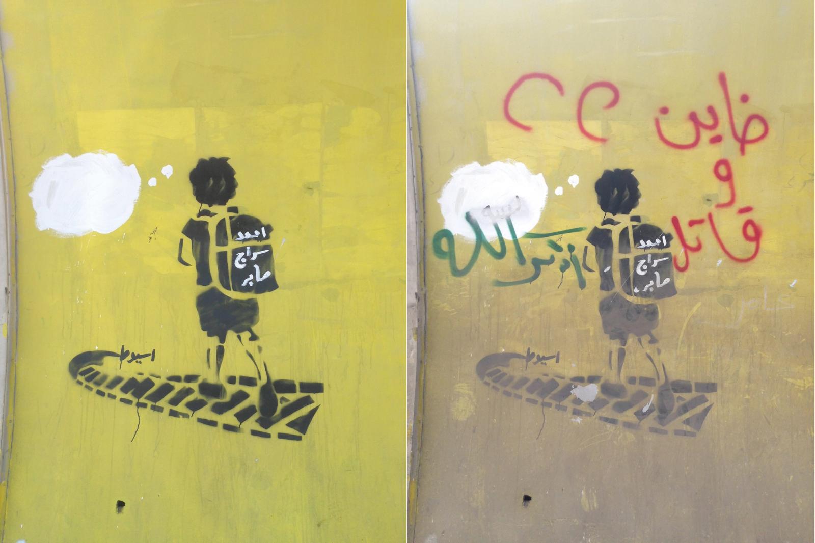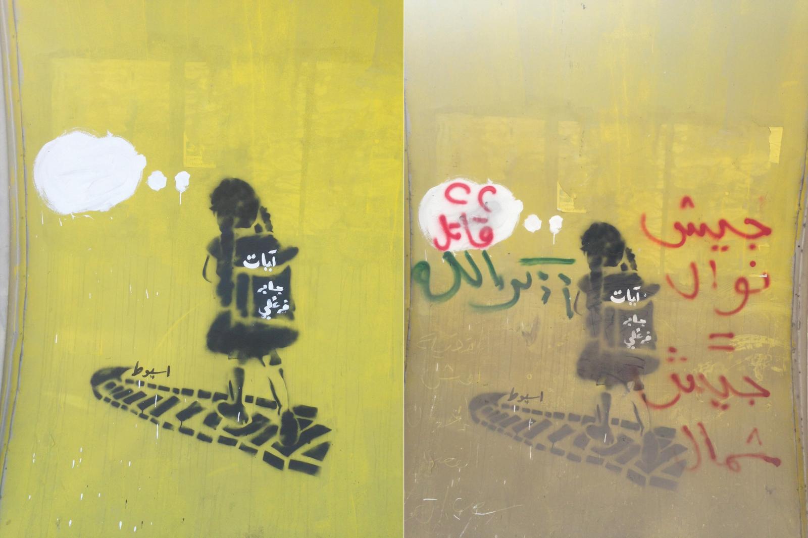 Figure 3. Inside bubble (in black by artist): Has illiteracy disappeared? Cairo, Egypt. Line 1, sprayed in black: CC is a murderer. Line 2, sprayed in white: Syria is free.