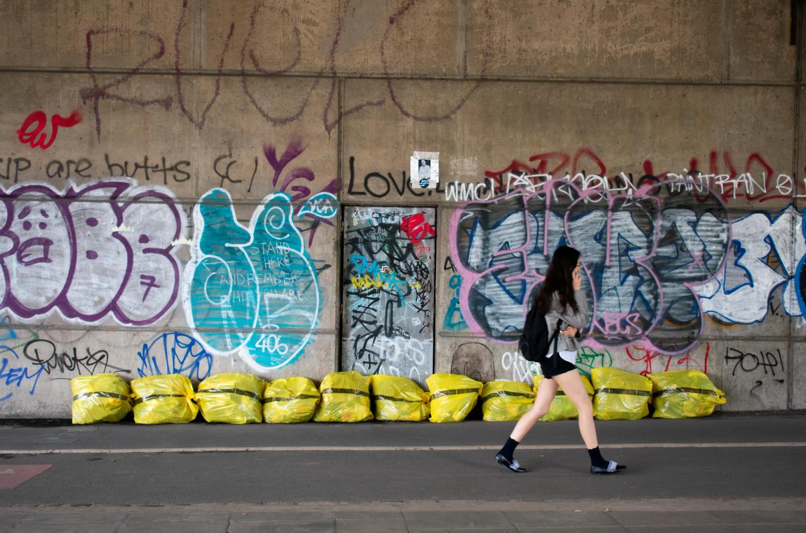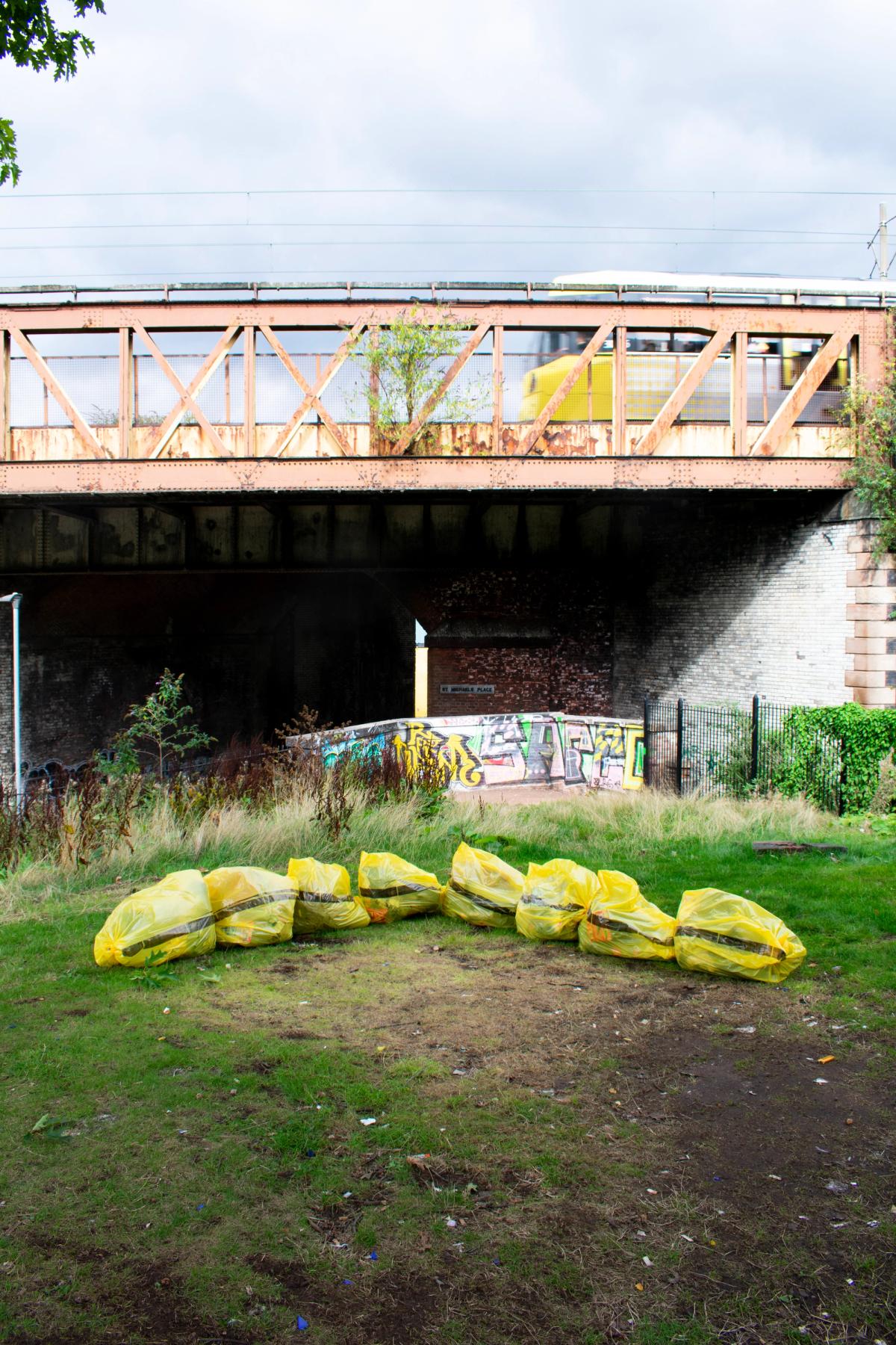 The project has grown into three distinct threads; works that illuminate the problem, those that imitate the immediate architecture the material was found in, and works that leave spaces immaculate. This third version, ‘bin bag works’, uses yellow bin bags with a thick black line to illustrate the amount of time given over to cleaning a given area. If any design is completed without the material being taken away, I contact the local council to inform them of the rubbish on site. The life of each piece is then from that phone call or email until the material is disposed of.