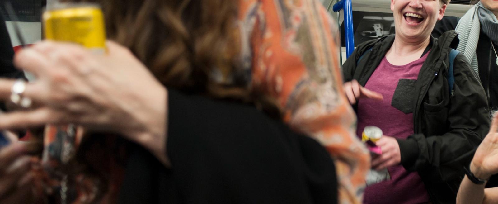 A couple – woman in blue coat and man, tall and grey – are on their feet. Hands holding blue bars, bodies engaged as they shift along and steady their gait while the carriage gallops on. We are now creatures that use our hands to get around; we hold, we touch, we are alive and we are here. Doors will open on the right-hand side. Nine more people on. Need a hand? Tell us what you think, we say. And now we are a scrum, a ball of people, a small intervention, a shapeless noise, talking, laughing, crunching crisps, sipping tonic.