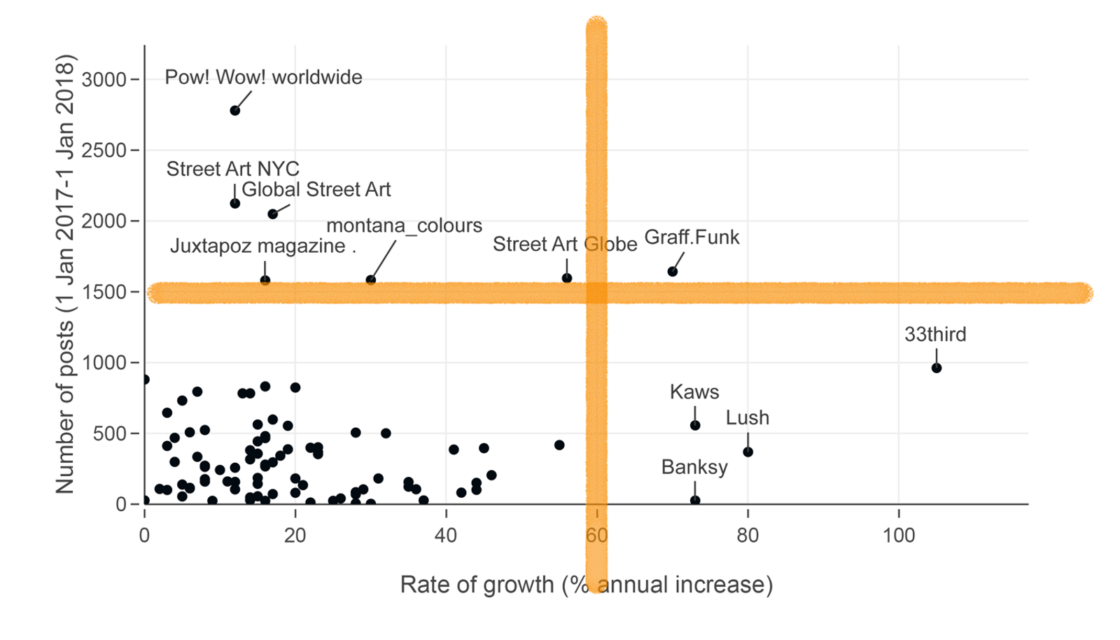 And then we come to the third quadrant in the bottom right hand corner. Again, an interesting cluster of data. Not so much in terms of where individual accounts are, but when we think about the rates of growth – if this was a share market, if you were thinking about what shares to buy, what’s hot right now, what are the accounts that are likely to grow really quickly – it’s in this little cluster of artists’ accounts. The accounts of three artists – Banksy, Kaws, and the Australian artist Lush (aka Lushsux) – are generating enormous growth, and we can attribute that to a whole range of reasons over a year, not just the number of works that they’ve made, but also the kinds of works as well as the kind of audiences that they are eliciting. Kaws has had a whole host of big gallery shows and other reasons why his Instagram account might be hot, Banksy’s account is always hot, and Lush’s work is often tailored specifically to the contours of Instagram, making arts data memes.