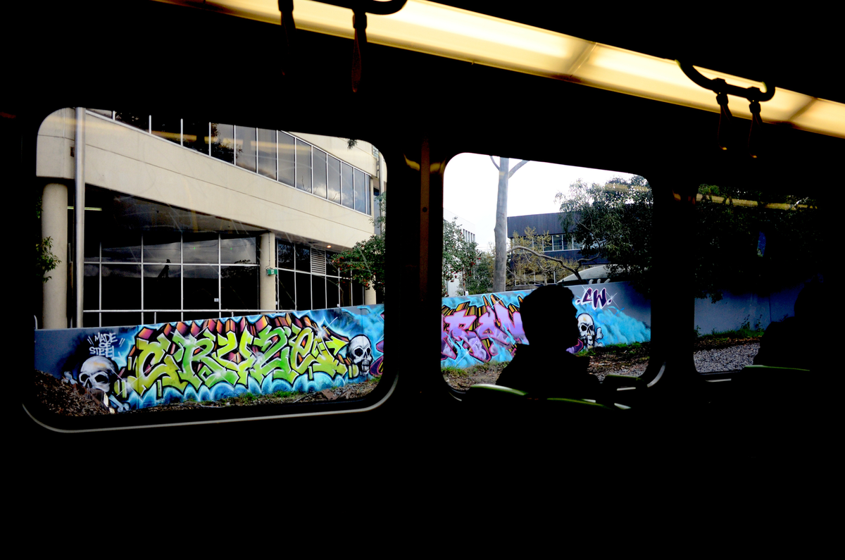 A Melbourne train carriage, with windows resembling the square format of the early Instagram feed.
