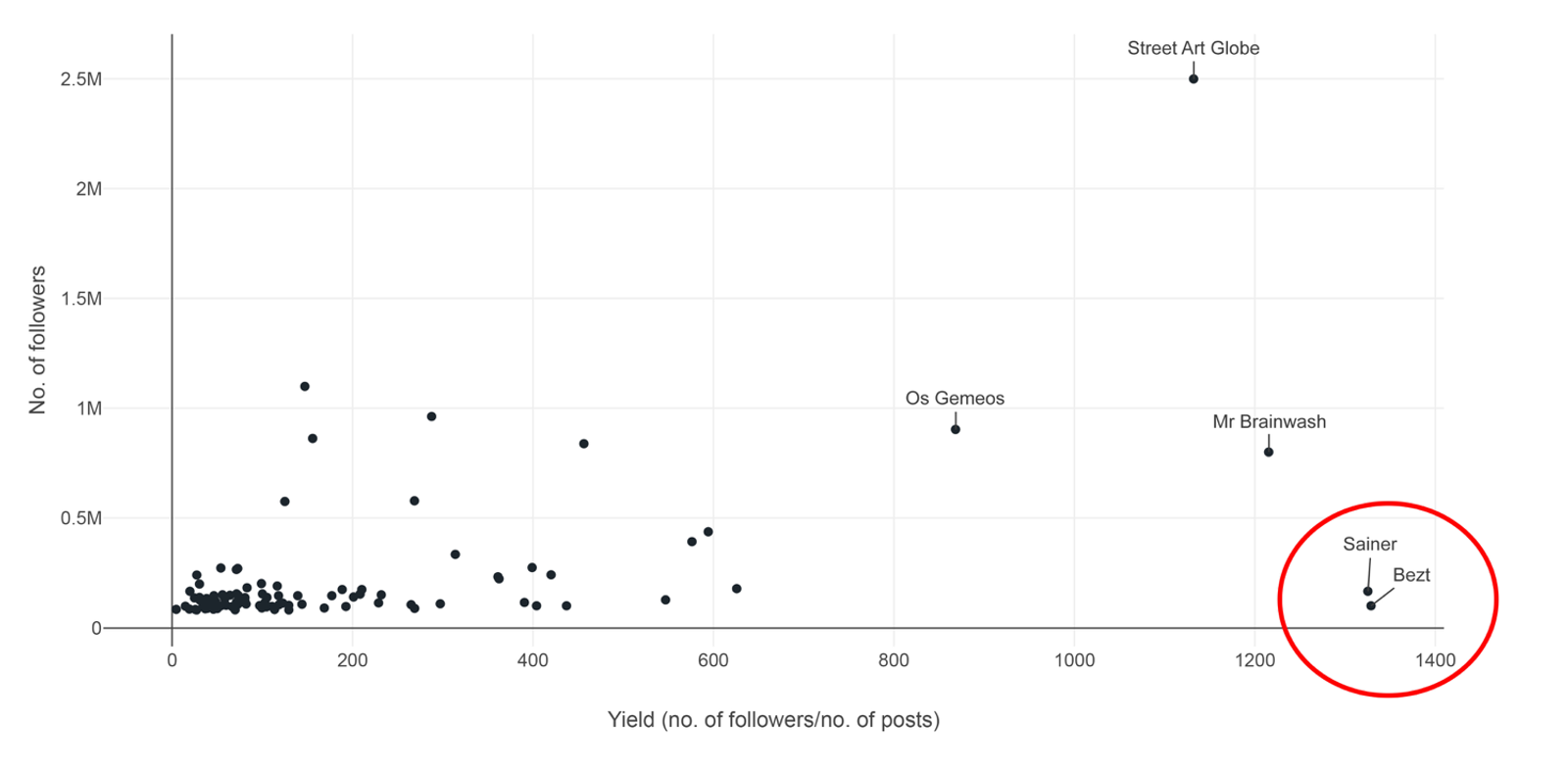 So, what happens to the data around these two accounts? What happens is a glitch in the system, which I will come back to in a moment. My question was, in terms of artists posting on Instagram, ‘which artists generate the most attention with the least number of posts?’ While some accounts post a lot of stuff to generate a lot of followers, other accounts post very little and yet still seem to generate a lot of attention. I invented a methodological category, which I call the yield of a post; the average number of followers that you would gain by posting something on Instagram. This yield will vary pretty widely for different accounts.