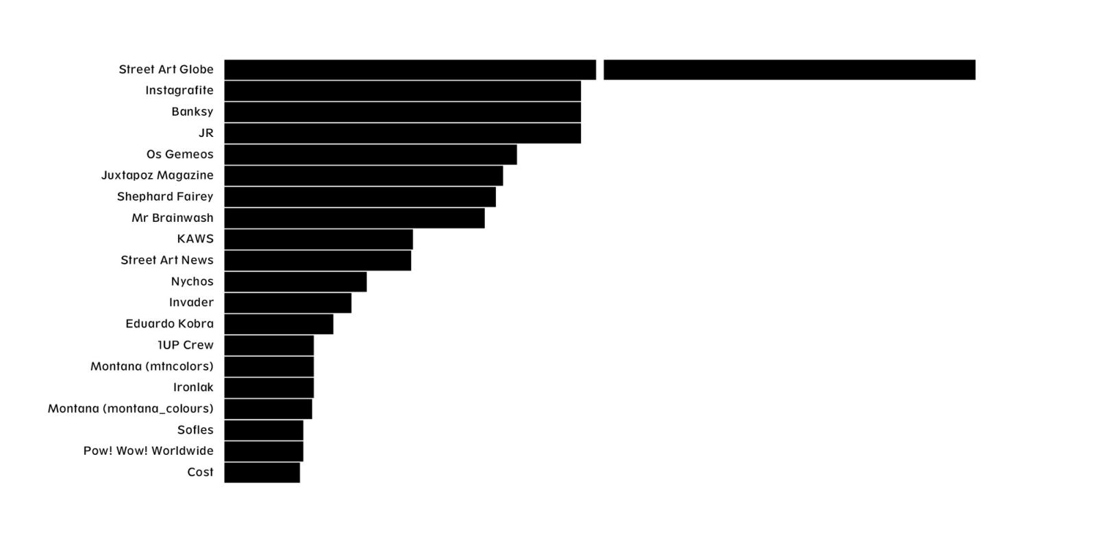 Let’s have a look at some snitching and glitching. I’m going to be the snitch in this and I’m going to call out the biggest account on the list. I’ve been tracking this data by hand for the last four or five years, and I want to tell you about just one element, one story, about the transition behind an account like Street Art Globe, which is now not just the biggest account in the top 20 list, but the biggest account by far.