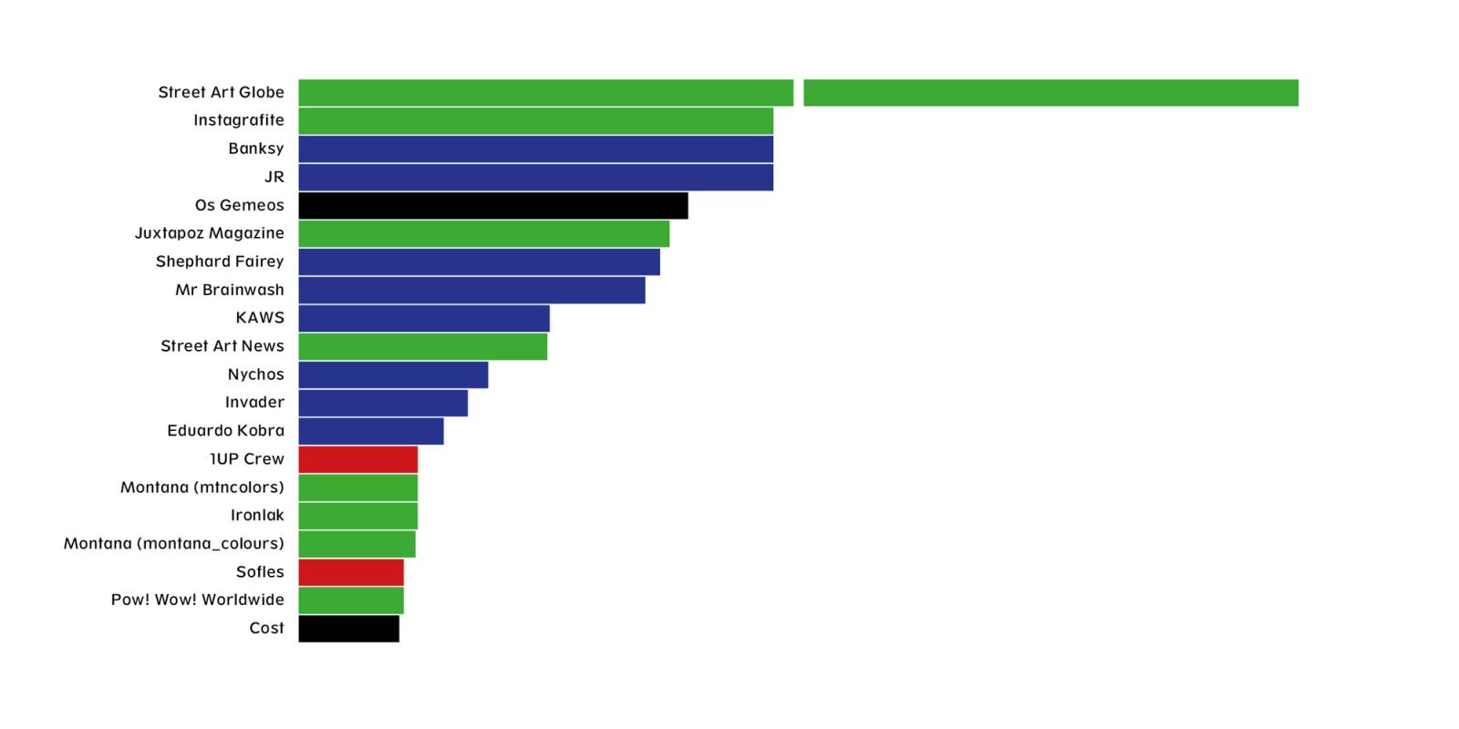 In each particular case, I’ve weighed up the artists’ allegiances to graffiti and street art in terms of their background but ultimately, I’ve simplified the data and given their Instagram accounts a kind of coding. All the green accounts in the image below are institutional accounts – they are not artists’ accounts, they are either aggregated displays of street art, or they belong to publications like Juxtapoz. You can see that the top of this tree of the elite is dominated by street art accounts, there are very few pure graffiti writers in this top 20 of most followed accounts. This changes as the data moves down. But thinking about how this might help us to address some of these debates really shows some of the complexity of this space.
