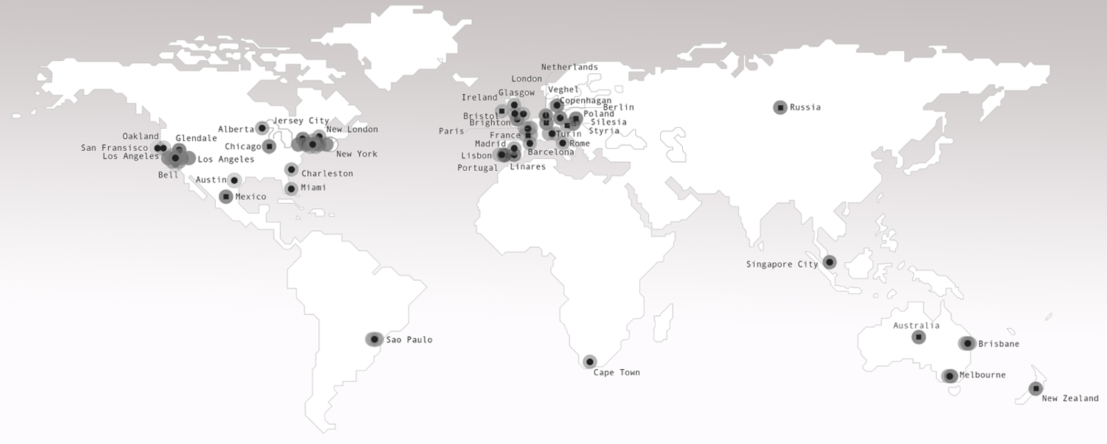 I’ve been developing data on the 100 most followed Instagram accounts for graffiti and street art, and I’ve used this data in many ways to try and visualise this global trend, particularly over the last four years. So, this is just one example; thinking about street art – which is framed as this global practice with our coffee table books full of images in exotic locations – we can see from this mapping that the elite in street art really are clustered in three zones: on the West Coast of the United States, in New York, and in Western Europe. So, while street art has shaped the globe in many different spaces, these metropolitan centres in the United States and Europe are still the focus of this kind of work.