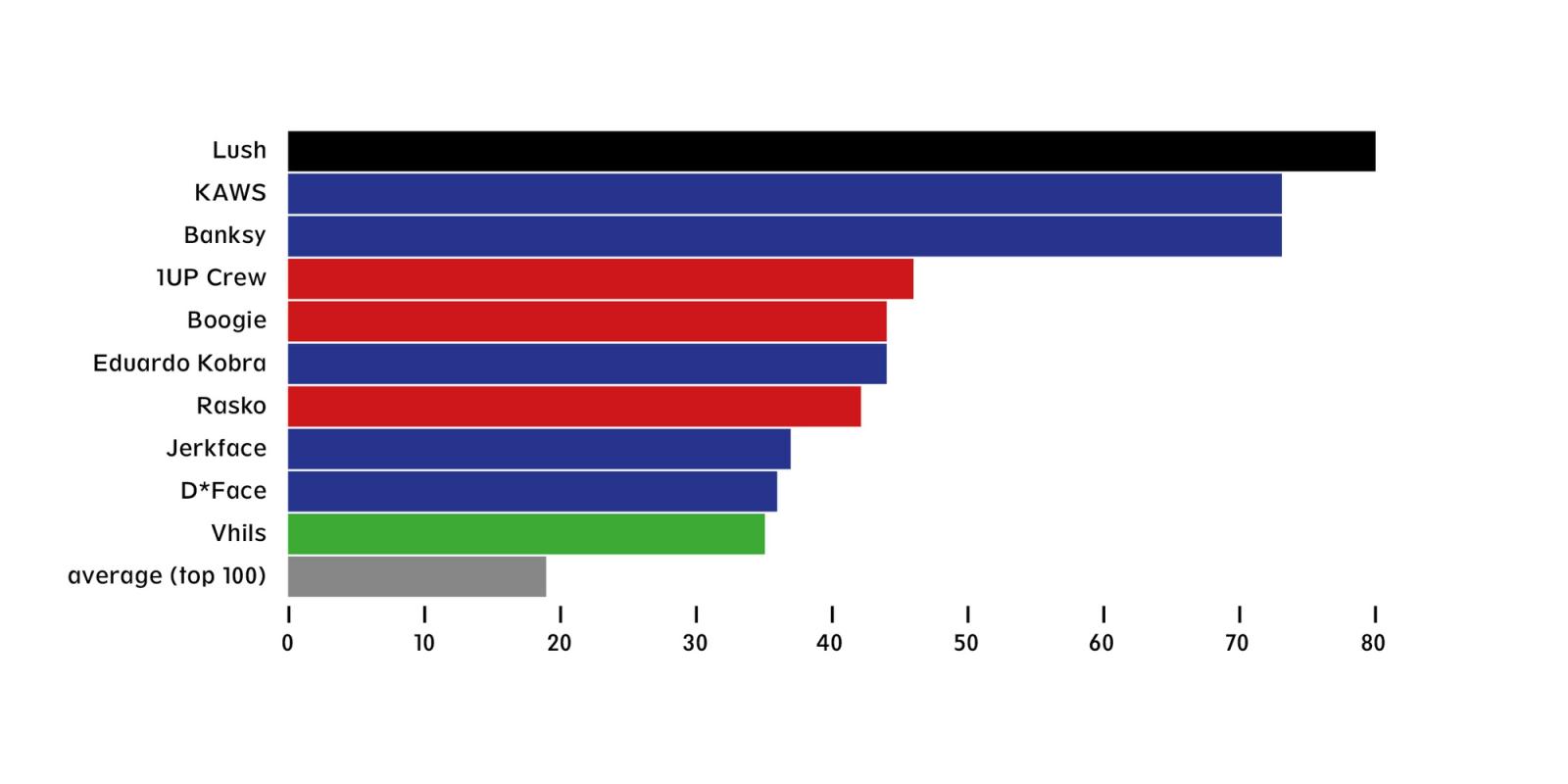 Finally, the image below shows the rates by which the accounts of the top 100 artists have grown over the last year. It’s another way of visualising the global institutionalisation of street art, but this time without thinking about how the architecture of Instagram is shaping the categories. Lush is on top of the list as a result of his explicit working of the Instagram platform, but other artists on this list make very interesting work too.