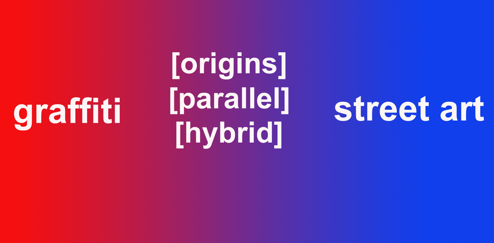 When we look at the artists in the top 100 you can see that they have very varied backgrounds, but on many occasions, there is often a very strong relation between graffiti and street art. Either the artists have had a strong origin in graffiti and then have moved into street art, or perhaps they have a parallel practice, like Banksy was rumoured to have a parallel practice of street art and more illicit graffiti, or perhaps they had a hybrid kind of notion. So, trying to think about this data, what does it look like if we begin to code it in relation to these categories? This is obviously a highly controversial exercise. It’s very difficult, for example, to think of a way to categorise the artist duo Os Gêmeos, as these two artists have grown up with hip hop, but now produce very much ‘street art’ kind of work. That’s why for me they exist in this hybrid (purple) sort of space.