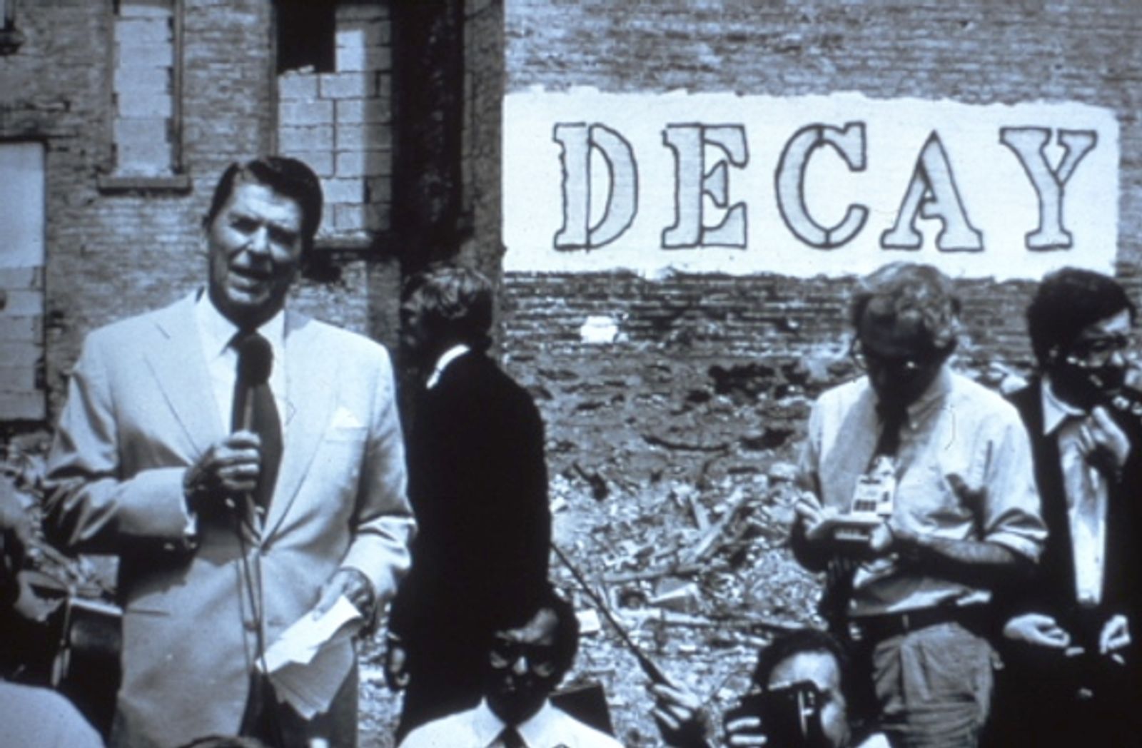 John Fekner: Most people think of the Decay series as being only about those huge stencils like Broken Promises – the South Bronx work. That’s the iconic image of the Decay stencil, co-opted by the 1980 Republican Presidential Candidate Ronald Reagan in the foreground. I guess that’s what people think of first. They’re big pieces. Those letters were three feet high!