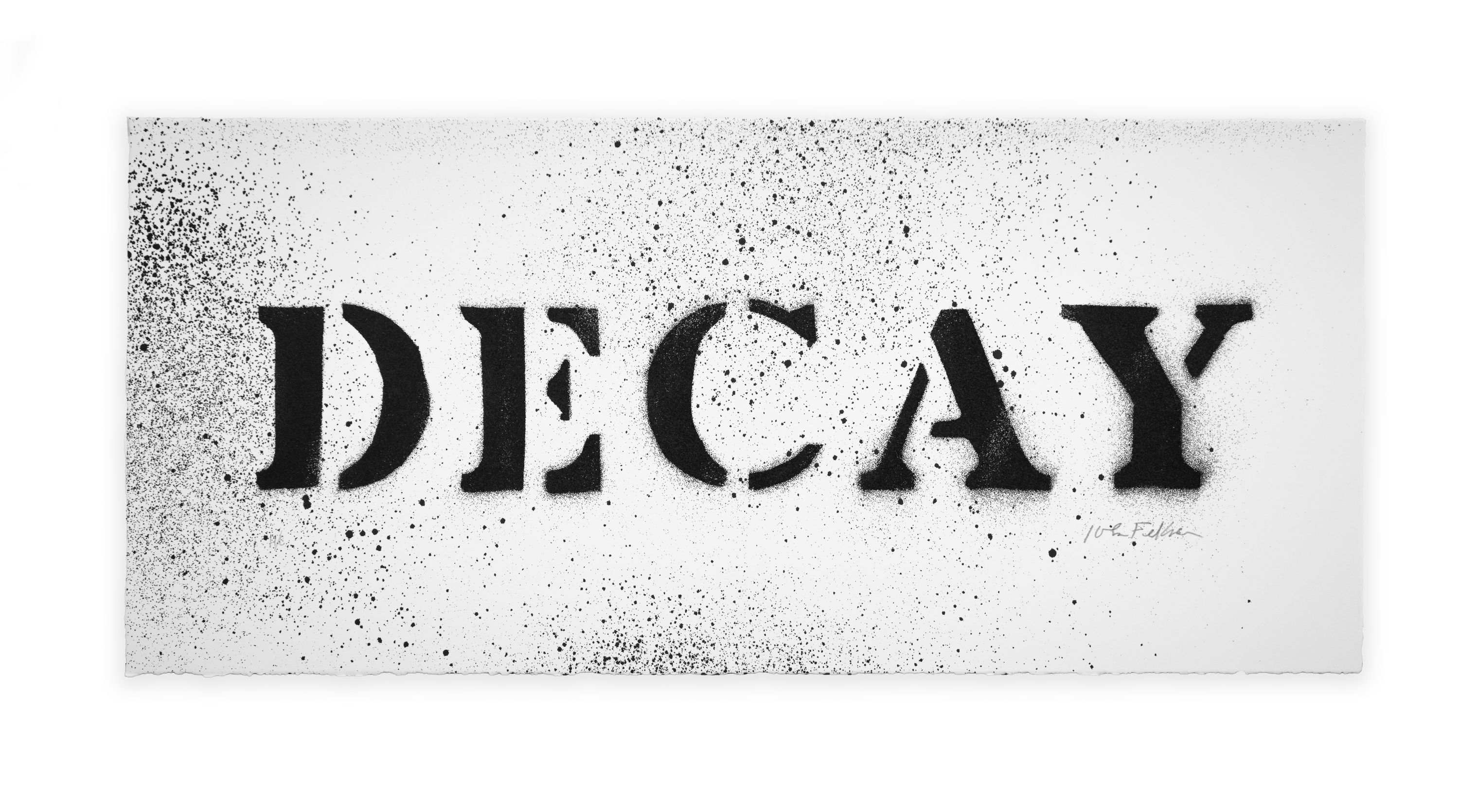 Most of my work was inspired by being involved with late '60s peace movements and listening to protest songs, all those ideas carried in lyrics from people like Phil Ochs and Bob Dylan. From this, I got the whole idea of condensing everything down to one line. Just a single line.The whole idea of conveying something complex and dense into a single phrase, similar to Jenny Holzer. One sentence philosophy. But then I reduced it from a sentence, to two words, and eventually to one word, Decay.