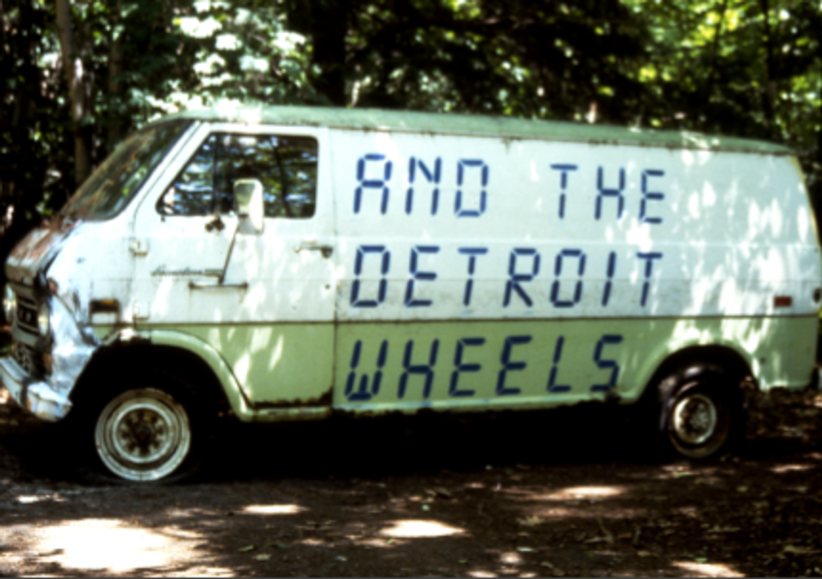 During my Oxbow residency, instead of doing my usual one or two word stencils like Decay, Abandoned or Visual Pollution, like I would normally use on abandoned vehicles, I painted And The Detroit Wheels on this wreck of a van. On a surface level, this was a musical reference to Mitch Ryder’s blue collar rock band, but it was also a critical reference to our location. Detroit was the home of General Motors, and Chryslerand Ford, and all the car factories that have since closed. The cars they produced had a planned obsolescence. Back then, all the cars leaked oil. You had to carry around oil cans in the trunk of your car in case you ran low, and we all left dark puddles of oil wherever we parked, polluting the planet.