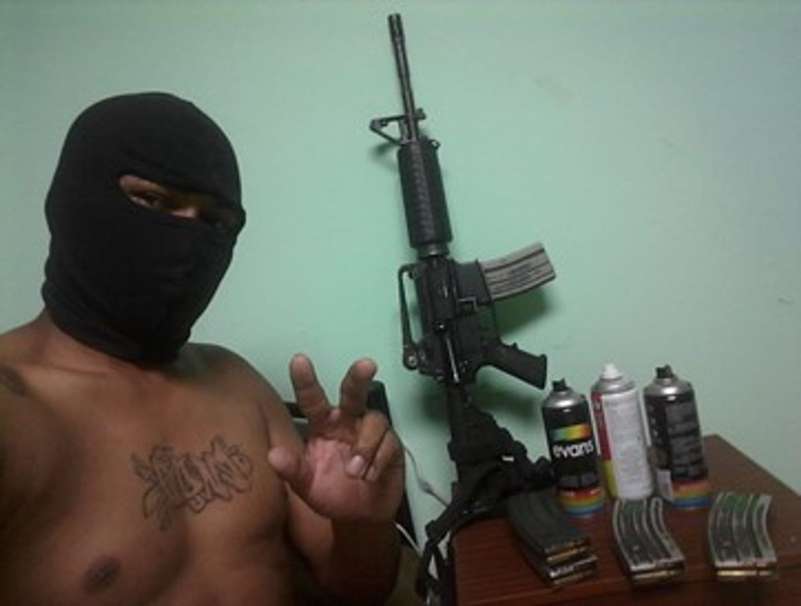 Figure 7 is a portrait of Snop 10, a member of theGobernantes del Norte(GDN, The North Governors) posing next to his own firearm which hints at his rank and seniority within his mob. Spray cans and weapons allude to a past when gangs took over Guayaquil. Nowadays, these groups are disarmed but maintain the tradition of chapeo in gatherings to evoke the culture of those days. The GDN tattoo on Snop's chest uses the skin as an extension of the sign and the signifier. Clearly, belonging to these groups involves a complex semantic system of representation and identity.