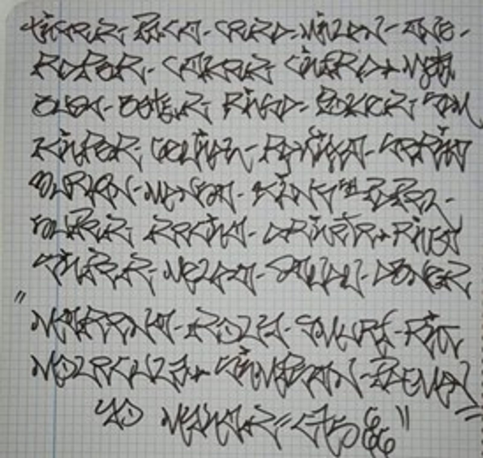 This description catches my attention because looking at the images shared by LR himself, aesthetically speaking ganchos has a striking resemblance to chapeteo. In fact, a careful analysis shows visual similarities between pichação, ganchos, and chapeteo. In their need to distinguish themselves from the aesthetics of graffiti, these three forms of writing developed during the same time span, i.e. between the ‘80s and 2000s. This need to differentiate from pure graffiti provides proof that more recent generations of urban writers have pursued singularity. In both form and substance, Brazilian, Mexican, and Ecuadorian youths had the desire to explore a calligraphy of their own. In geographical terms, these types of practices manifest themselves in the north and south of the Americas, as well as in the middle, which is more or less where Ecuador is situated. These are geographic poles which, in terms of their sociopolitical, economic, and cultural circumstances, narrate their own history and contextual ‘archeology’.