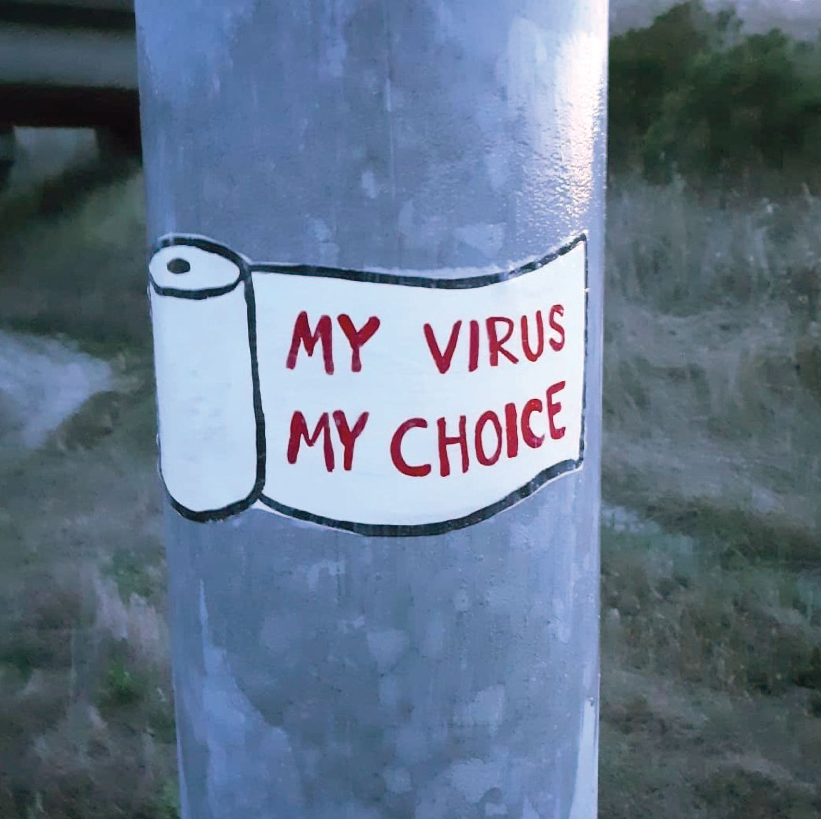 In March and April, many works in the streets around the world expressed doubts about the threat of the Coronavirus, often articulating a fear or distrust in government. An example is a short line that reads ‘Covid is a scam’, hastily written on a barricade that was used to close off a street, turning it into a pedestrian pathway during a period of lockdown (Figure 3). The Velvet Bandit's small paste up ‘My Virus, My Choice’takes a dig at the politicised responses to COVID-19 and resistance to government mandates, especially in the USA, where restrictions that are put in place based on scientific evidence and in the service of the public good are often challenged on political grounds (Figure 4).