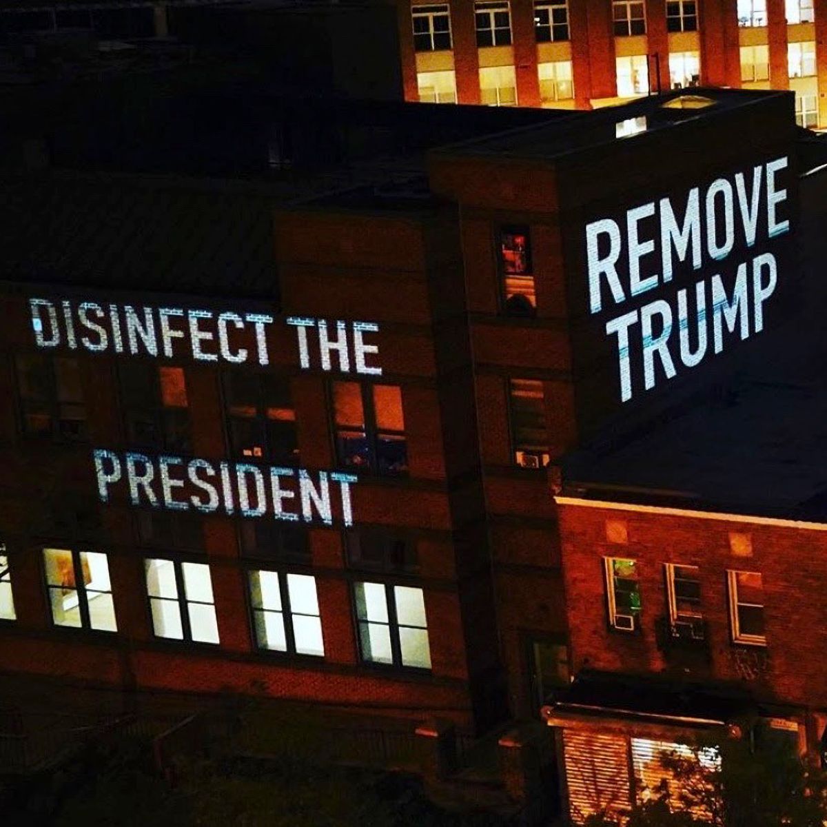 In the United States, where the former president and other leading officials have actively undermined the work of scientists by putting in place policies that run contrary to scientific evidence, a number of works focused specifically on White House advisor and immunologist Anthony Fauci, especially in New York, where the impact of the virus was particularly severe in early spring. Dellarious, for example, created a life-sized image of Dr. Fauci dressed in his signature suit and tie, holding a cardboard sign reading ‘Trust Science (Not Morons)’ (Figure 5). Justifiably, many other works centred around the president himself. On April 23, 2020, Trump suggested in a briefing that a disinfectant might be used internally to ‘cleanse’ the body of the virus. The next day, Robin Bell responded with a light projection in Washington D.C. reading ‘disinfect the president’, referencing this absurd moment (Figure 6). Representations of Trump as a virus are also frequent, such as ‘Vote Out the Virus’ with a grotesque closeup of a scowling president.