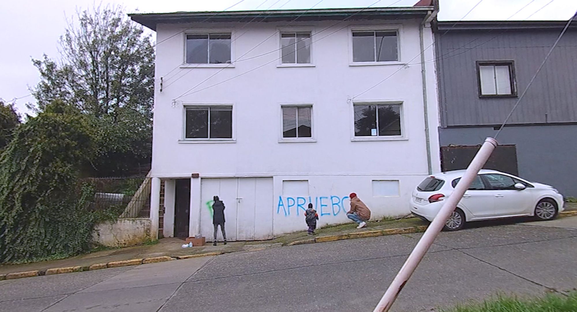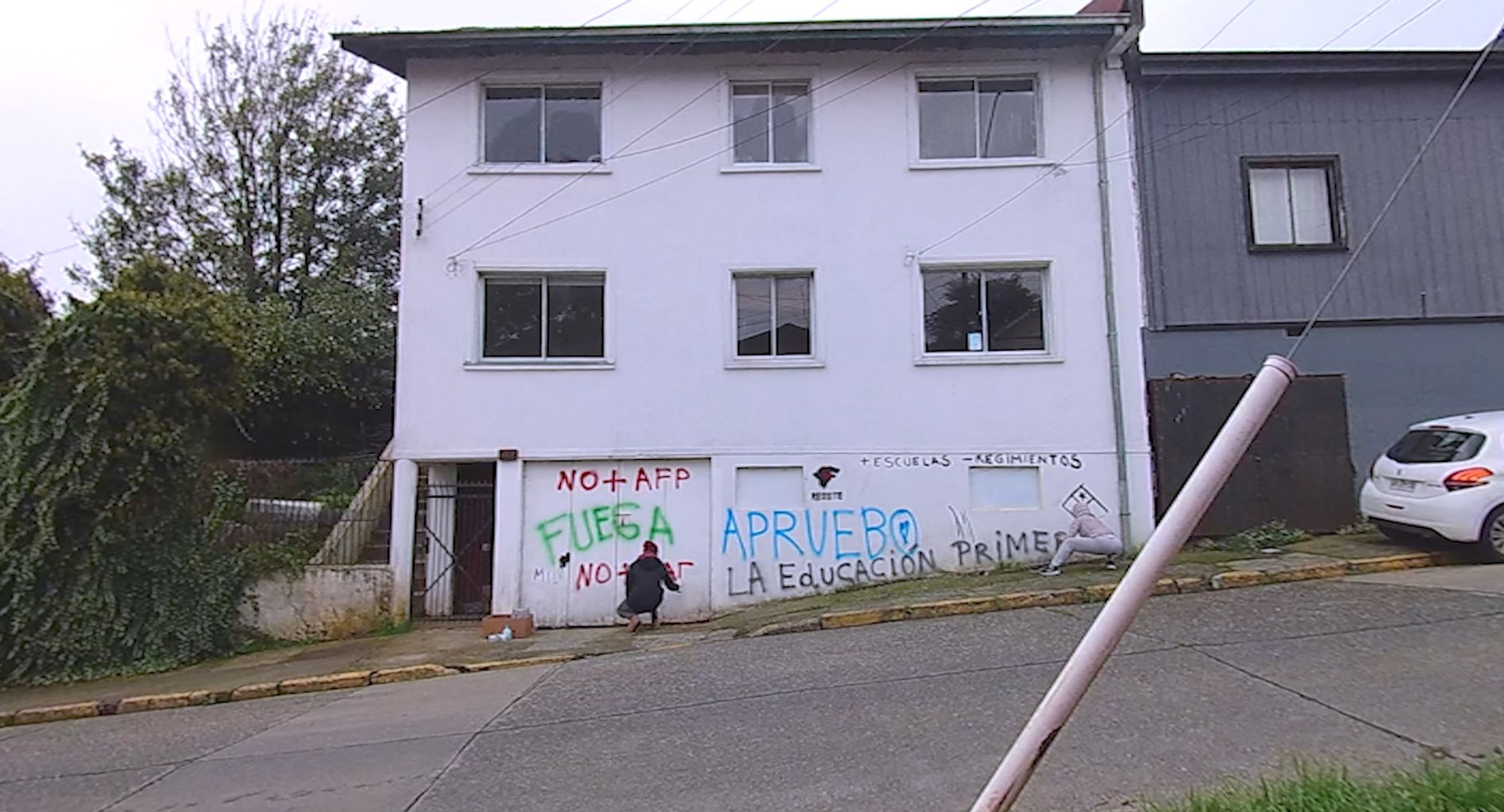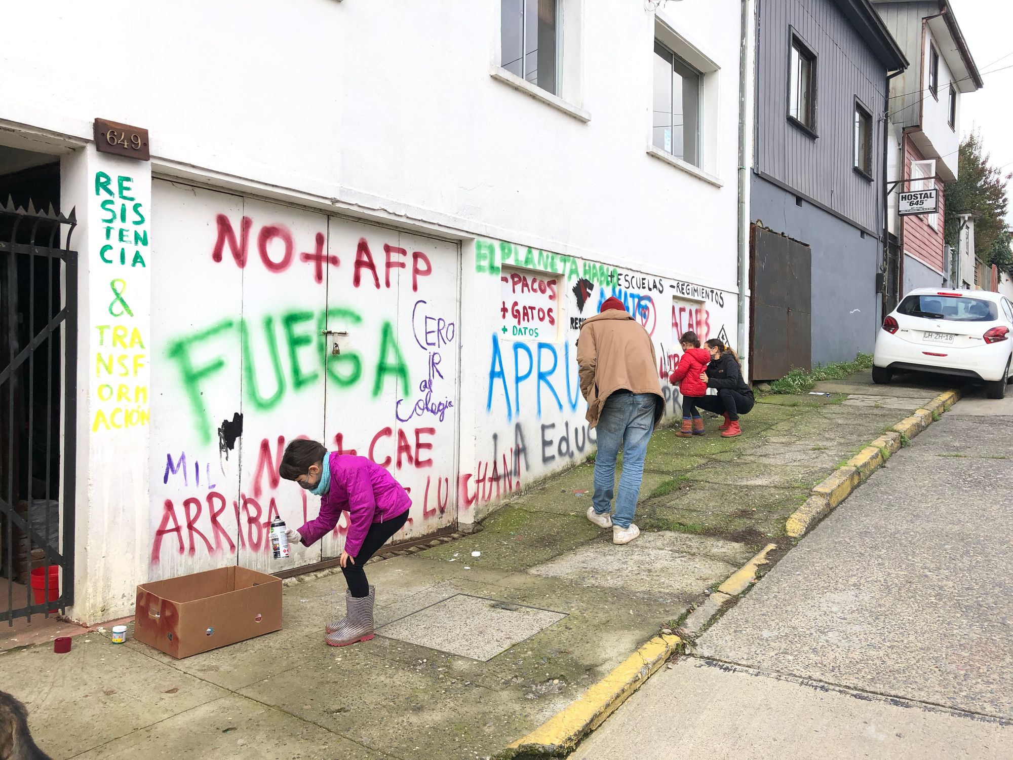 As these possibilities had been ripped away, we decided to offer a wall of my own house in Valdivia, which miraculously had not yet seen a single mark of graffiti. We invited both grown-ups and children to restore messages that elsewhere had been removed. The mural we created is not beautiful, but it is heartfelt. Chile does not need beautiful or witty street art. Many of its people are so fed up and oppressed, they just need a valve to release the pressure that is weighing down on them.