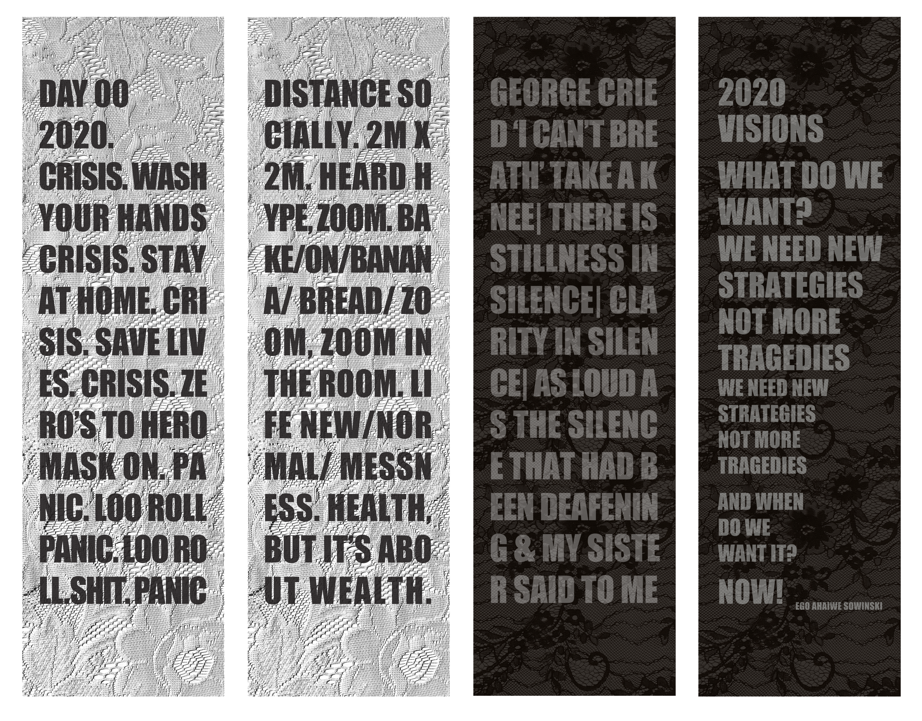 The white lace curtains for the artwork were salvaged from the street in Hackney Wick, East London, during the mass pandemic spring clean that took place during the height of lockdown. They begin with the words ‘Day 00’ in reference to the first official day living our ‘New Normal’ lives under what felt like a house arrest, patiently or impatiently waiting for instructions from our leaders in what actions and precautions we were supposed to be taking. The texts are based on the endlessly drilling and repetitive government guidelines on washing hands, staying at home and saving lives. Other observations include the loo roll panic and the cosmic collective consciousness that was baking banana bread and using Zoom. Composed in the midst of a global pandemic and an uprising, the narrative’s hint of darkness and ironic plot descends into heaviness, ending with a penultimate of conversations between Wilde and her long time art college friend and artistic collaborator, the artist and archivist Ego Ahaiwe Sowinski, who is now based in Minneapolis.