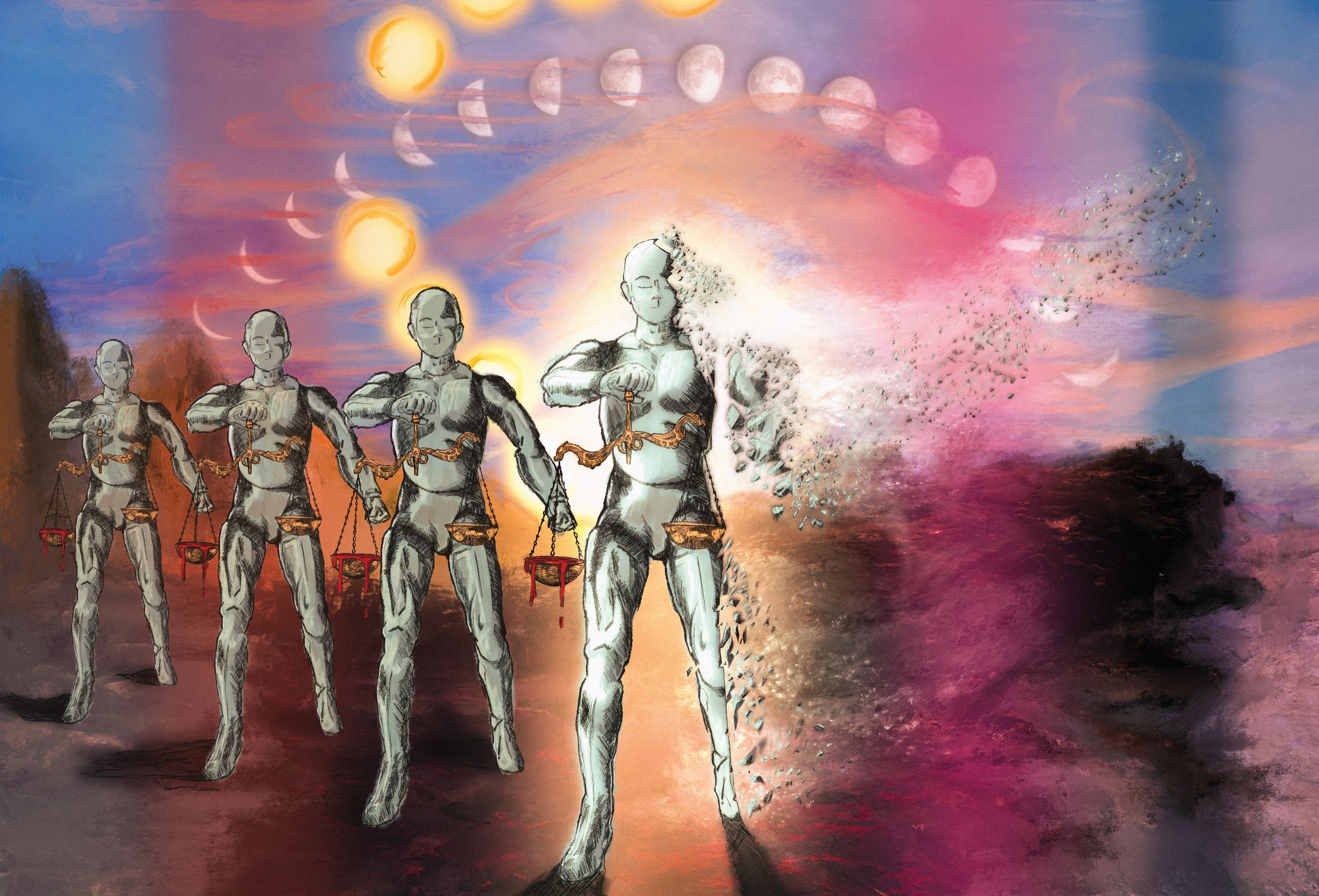 Law students experienced Entropy Awakening as ‘haunting and dark’; ‘mesmerising’ but with a ‘sinister edge’; ‘beautiful … [yet] deeply disturbing’. The imagery of the suns, moons, and scales of justice indicated law’s failure to adapt or change over time; ‘the law … protect[s] its racist foundations’. The blood in the scales was felt to be a powerful representation of intergenerational trauma or that access to justice is a farce; law as ‘a tool of concealing, managing, and relocating power away from non-western cultures’.