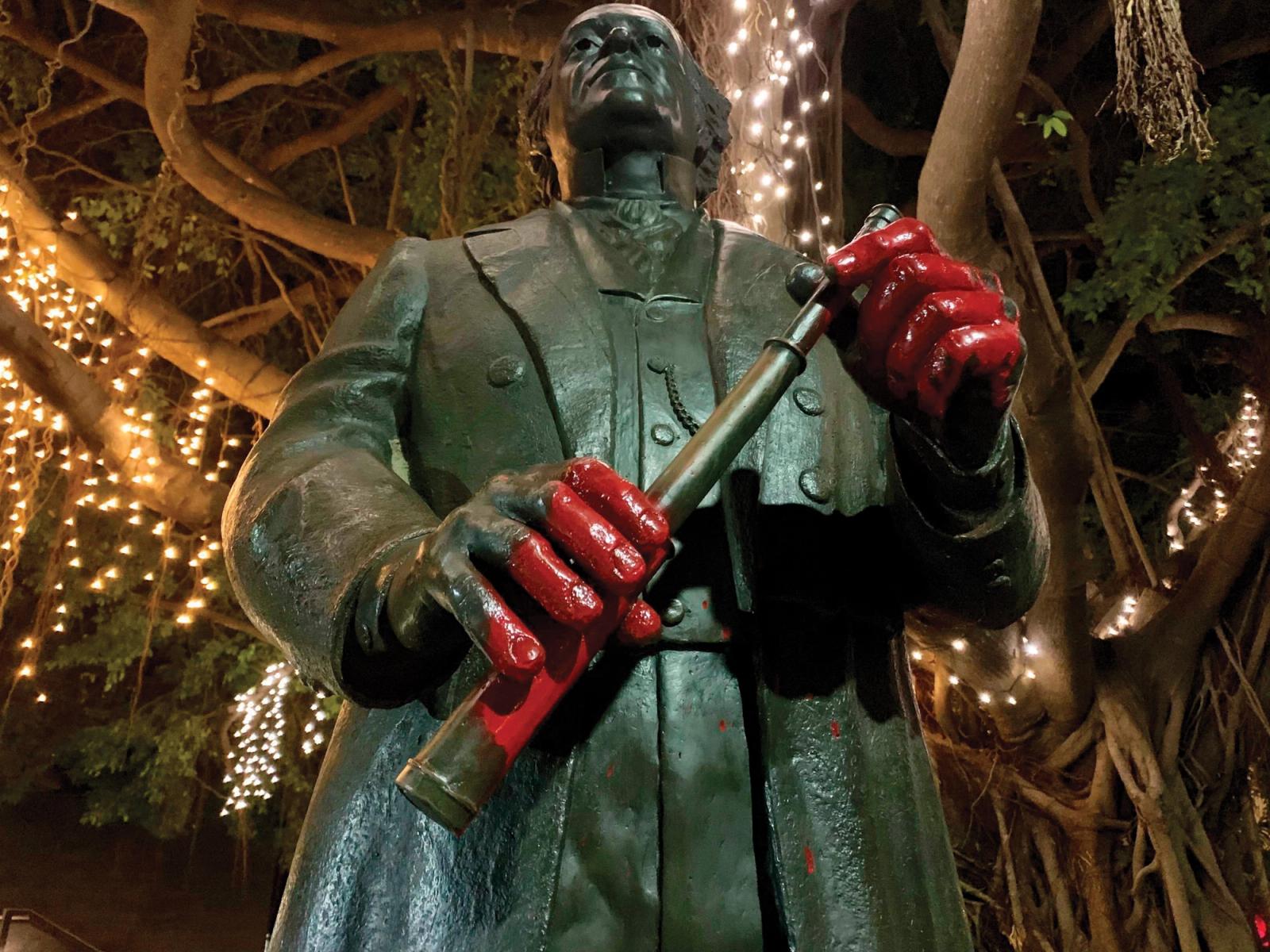 For these reasons, some activists have taken matters into their own hands and graffitied contested statues with anti-racist slogans and imagery. For example, in June 2020, political activist Peter John Wright painted red hands on a statue of Robert Towns (Figure 2) and wrote ‘slave trader’ on the accompanying plaque. He did so in protest of Towns’s links with Queensland’s slaving history (‘blackbirding’) and called the placement of the statue in Townsville’s central business district ‘a stain on the moral conscious [sic] of this town’ (quoted in Chomicki, 2020). Most recently on Anzac Day, a national public holiday for commemorating veterans, a statue of Major General Lachlan Macquarie, New South Wales governor between 1810 and 1821, was smeared with red paint, handprints, and inscribed with the phrases ‘no pride in genocide’ and ‘here stands a mass murdered [sic] who ordered the genocide’ in protest of Macquarie’s ordering of his soldiers to kill and capture Indigenous Australians during the frontier wars (Sharma, 2023).