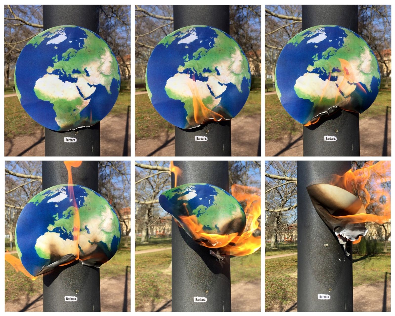 The medium of video often emphasizes – even more than photographs – the importance of the action of attaching a work. A video without cuts, showing time and space, is first and foremost an animated serial photo sequence. Here we are close to performance, happening, the unique theatrical, physical moment, which one does not see in the finished work, but its traces are inscribed in the documentation, for instance roof top graffiti or the burning of items (Figure 2).