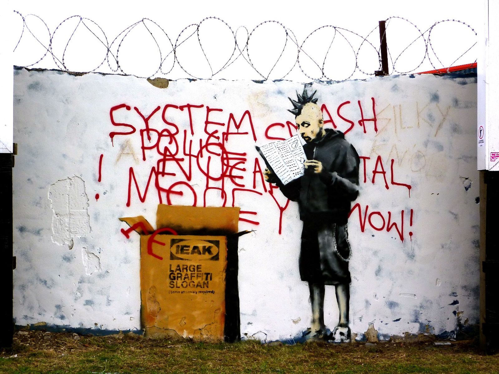 As the majority of street-art-viewers shifted from the street to the internet – which occurred in parallel to faster loading times and better digital cameras and was therefore mutually determined – the form of street art changed as well. In Banksy's case, the goal was no longer to create a motif that could be reproduced on as many backgrounds as a stencil to be seen on the street by as many viewers as possible. Now he published just one work online, but larger and with more colors than before. This work and photograph then had to be perfect. To use a stencil, a medium of reproduction, became obsolete from a practical point of view. It is reminiscent of the history of the medium and of Banksy’s former works, and charges the new, single work with that meaning of the past. Artwork and photograph are mutually conditional here. If you happen to see a street work in situ, and the work was designed for viewing on a PC or mobile phone, it often seems disproportionately large, precisely because the artist already factored in the likely viewing size of the photographs, which need to have an impact even when viewed as a relatively small image.