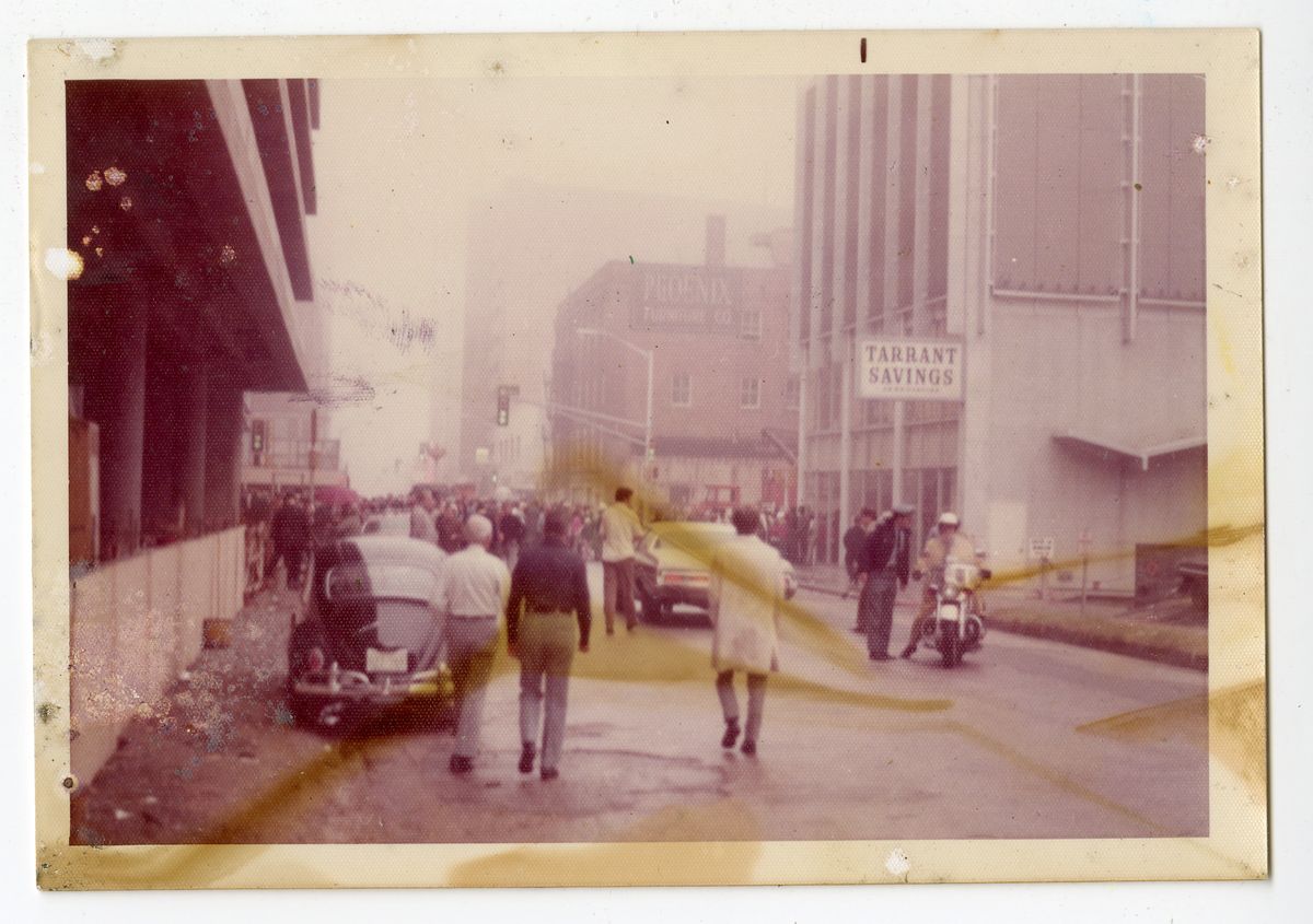 We inscribe urban art on walls, etch it on windows, perform it in public space, hide it in alleyways and underpasses, glimpse it on passing freight trains. We also discard it in waste bins and trash bags. Digging through these bins and bags unearths cardboard boxes, food, clothes – the detritus of everyday urban life. It also reveals a distinctive sort of urban art: the photographic evidence of this everyday urban life past and present. Parents die, couples split, attics and basements get cluttered and then cleaned, memories get digitised – and as part of these processes, old photographs come loose from their origins and find their way into the waste stream. The intended subject of these photos is often a parent or a child, a holiday or a birthday; but the background subject is often the city itself, the particular urban milieu in which such photographic moments unfold. Other times the subject is overtly the city, or some other city, worth noting visually when animated by an unusual event, visited for the first time, or encountered as a long-imagined destination. Scattered around the city, secreted away in its refuse, are images of the city. Lost, they wait to be found.