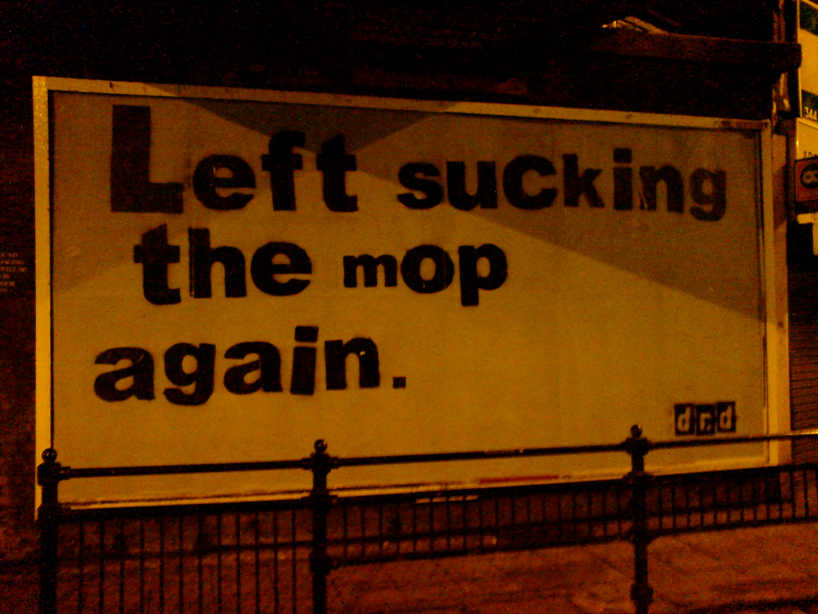That’s put passersby firmly in their alienated place then. But there’s more. In the photograph I showed it seems at first – still-fresh wet glue stain framing the work – an arbitrary one-liner. A withering remark randomly slapped on half a sheet of ply leaning against a roadside barrier. I thought just to have succeeded in intervening in this corporately saturated, civically micro-managed space is something of a coup as to seeding alternative voices in the midst of, and at the same time commenting on, consumer culture.