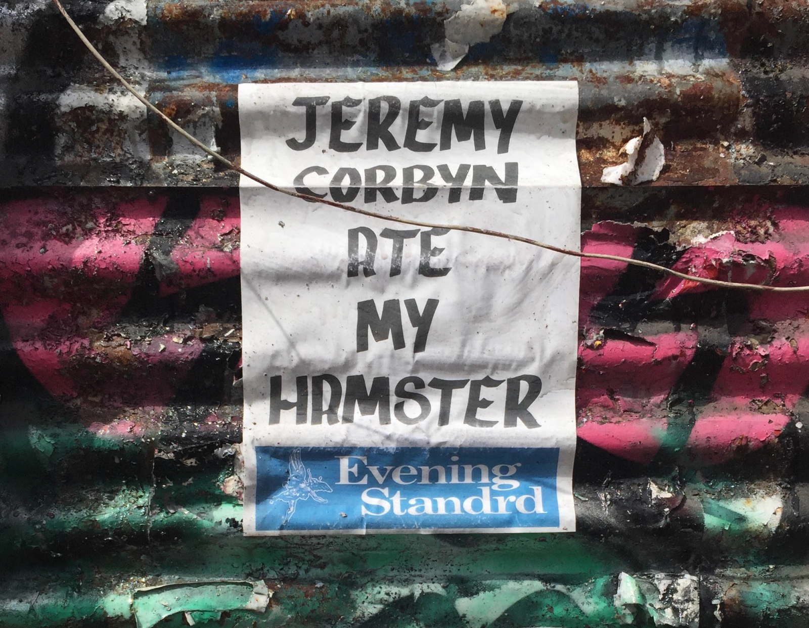 Dr. D’s Evening Standard poster work that reads ‘Jeremy Corbyn Ate My Hamster’ makes reference to the veteran Labour leftwinger whose election in 2015 to become Leader of the Official Opposition was one of the biggest upsets in British political history (Figure 8). It also invokes an apparently trivial tabloid headline about a comedian ‘Freddie Starr Ate My Hamster’ from 1986, and succintly demonstrates how mainstream media frame and demonise political developments and individuals who challenge the interests of rich and powerful establishment figures. When you learn it was the notorious publicist Max Clifford who encouraged The Sun newspaper to run the original Freddie Starr story even though he knew it wasn’t true, the Dr. D work becomes a critique of underhand, profit driven media misinformation and the cynical manipulation of publics.