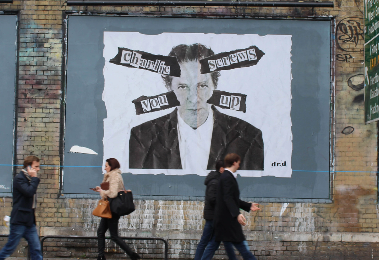 The ‘Charlie screws you up’ work is a prime example of DIY interventions on the urban environment affording an effective platform for disapproval. Often a starting point for Dr. D’s interventions is to ask the very straightforward question “What’s the problem?” The problem addressed in the work featuring Saatchi was an occasion of domestic violence in a public place: a bully abusing their power. Saatchi and Lawson were divorced shortly afterwards.