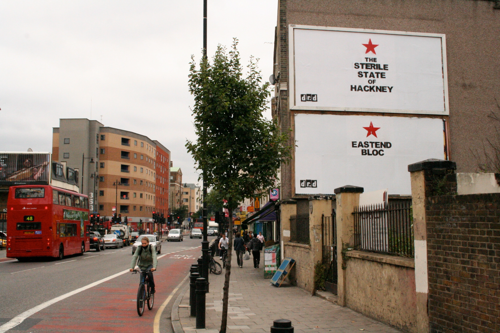 The Sterile State of Hackney and East End Bloc works appeared throughout said borough and more generally around East London. You might think the Marxist-Leninist red star and sparse block-capital lettering, the scale and God-like vantage point – certainly of higher billboards – all indicate a somewhat dictatorial declaration. Pasted up, however, during the death throes of New Labour, one can read the appearance of the red star motif as a cheeky dig at Blair and co.’s neoliberal dilution of core socialist values.