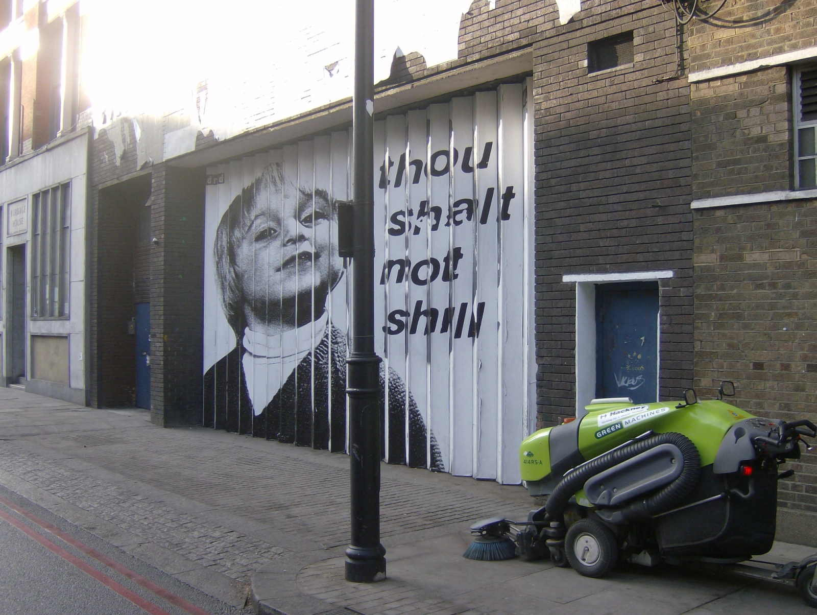 Choosing to ‘stamp’ the city with enigmatic ‘appeals to question’ rather than – what they may first appear as – dictatorial sloganeering suggests an instinctive knowledge of the ‘slipperiness’ of texts on Dr. D’s part. The viewer is not quite told what to think but pointedly invited to wonder what the ‘Sterile State’ is referring to. Is it the then notoriously incompetent management of funds, schools and services by Hackney Borough Council? And what does ‘Bloc’ mean? That venal scramble by an ‘alliance’ of East London boroughs to carve up and scoff from the pre-2012 OIympic trough?