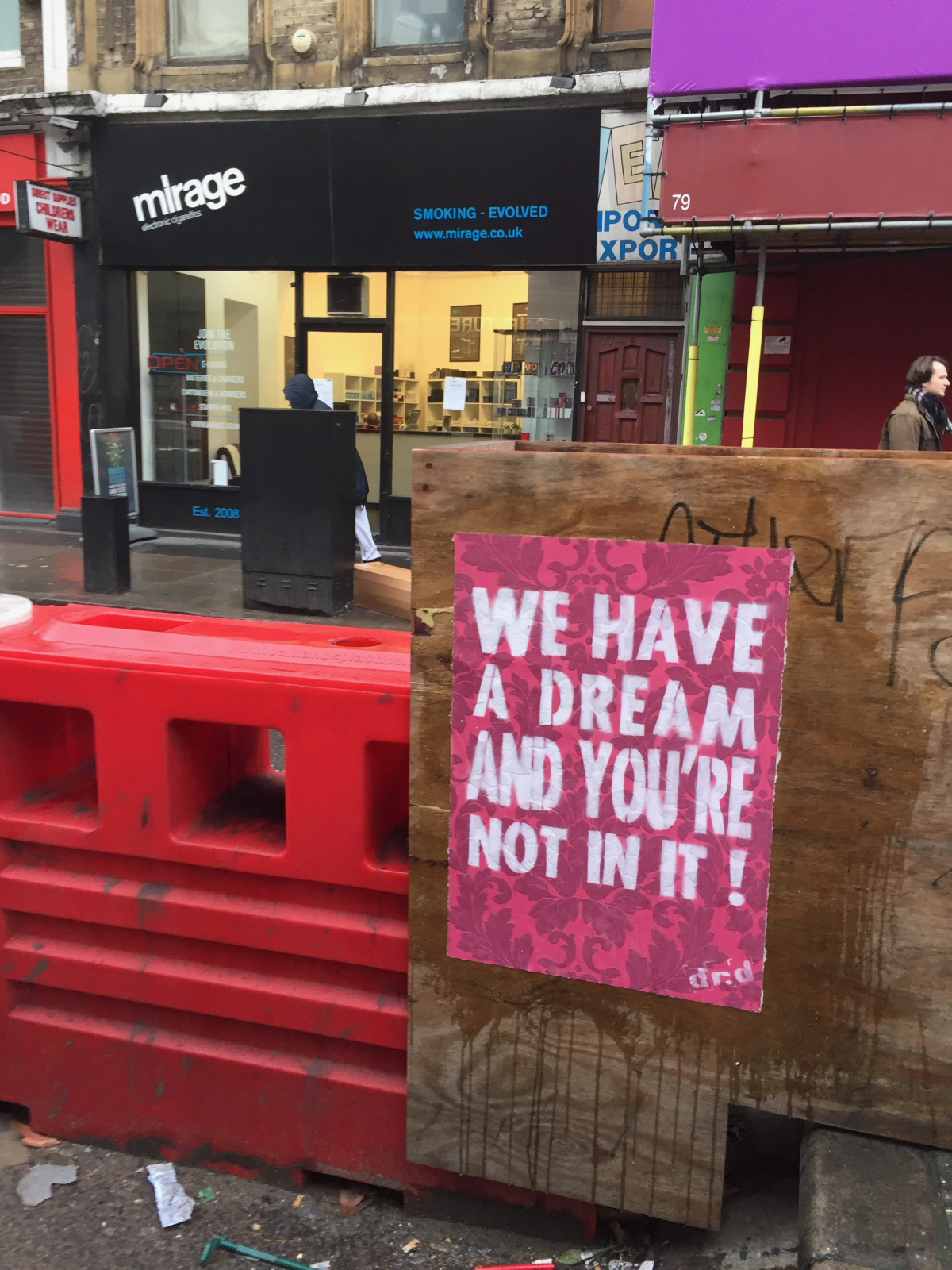 Then in the background you catch the name of the shop the poster is pasted in front of: Mirage electronic cigarettes. Now, ‘We have a dream...’ isn’t just a general general jibe in an amorphous urban context. Its placement uses a feature of its immediate surroundings to open up, to expand its pertinence. Who’s the ‘We’ referring to? Is Dr. D casting the whole urban spectacle as ephemeral or unreal as a mirage? Something we shouldn’t trust?