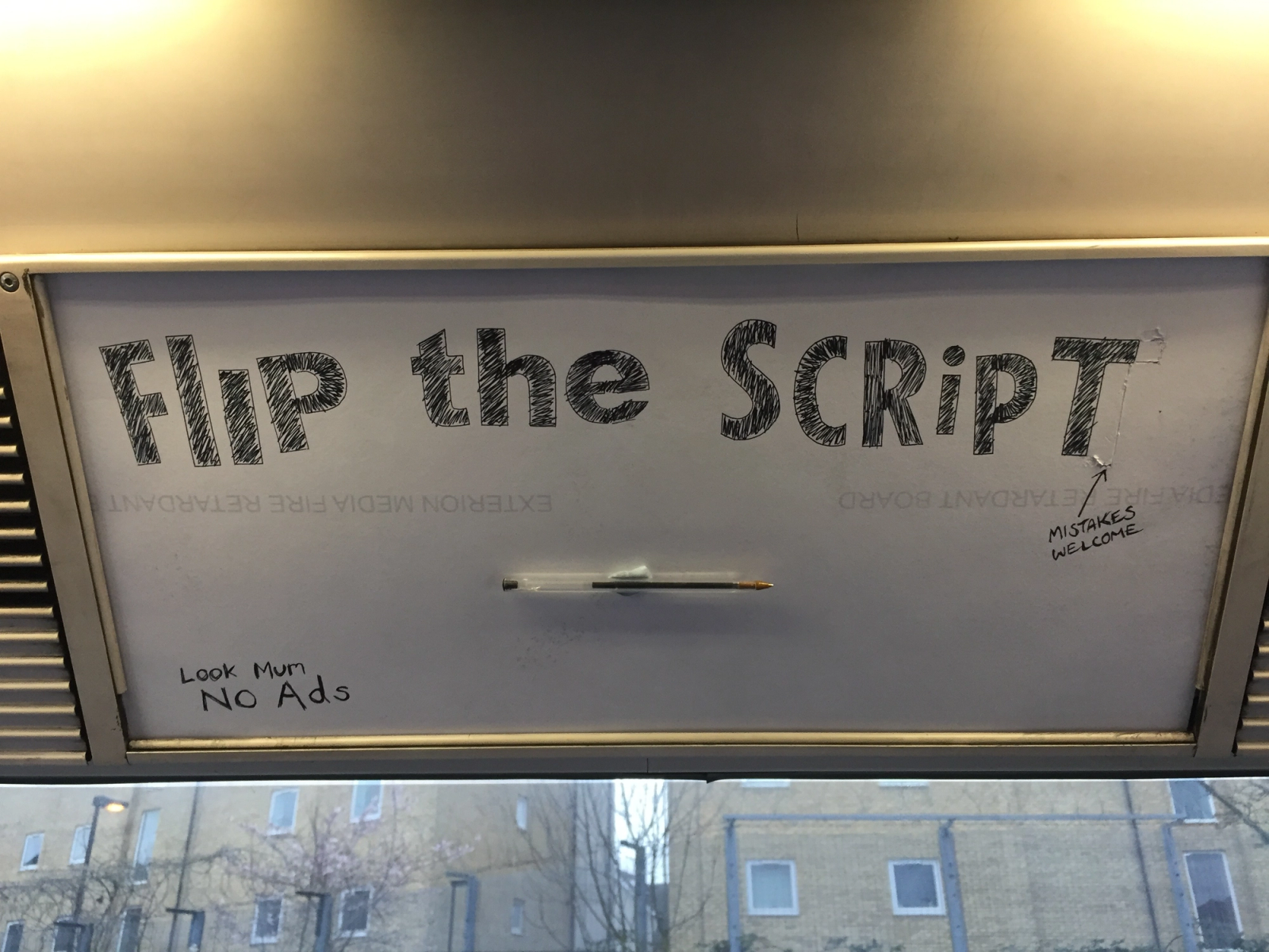 Another recurring feature of Dr. D’s practice are his various interventions that represent and enact participation – works that in quite practical terms invite/promote involvement and public dialogue. These can take the form of ludicrously direct, spontaneous ad takeovers. For example, removing existing panel ads on London Underground trains, turning them over and using that blank canvas to make a work before reinserting it back into its original frame. Dr. D’s Flip the Script takes this approach (Figure 5). A ballpoint pen simply Blu-Tacked to the work, the cheeky ‘woz-ere’ type comment: Look Mum NO Ads and another scribbled reassurance confirming that mistakes are welcome. This, again, is deceptively simple. As well as the literal invitation for alternative voices to contribute to, and contradict the corporate wraparound, its ad hoc form both mocks and interrupts the often too slick surfaces of our urban environment.