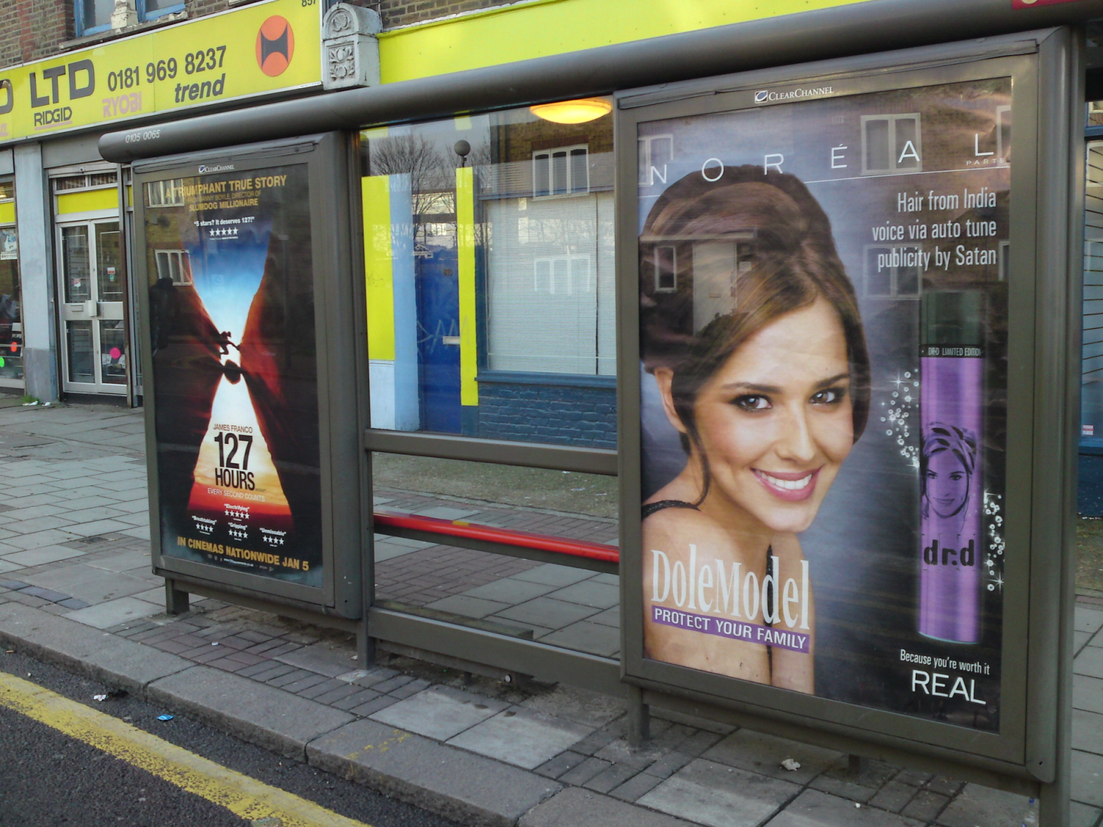 Hair from India. Voice via auto tune. Publicity by Satan. A key feature of this vein of work is how Dr. D is apparently seeking to be more thoroughly ‘woven into’ the urban fabric rather than stamped on to its surface. Also, with N’Oreal, in part the point is that we absorb the image, and take it for granted, pretty much as we would any ‘pleasing’ example of the advertisers’ seductive (normative) handiwork. Clocking visual activism in official ad sites can lend them a sort of delayed impetus that contributes to their effect. These works remind us that our lives are continually filtered, mediated, trammeled: be that by personal earphones, screens, ‘happy’ pills, endless exhortations to consume and, at the same time, to do as we are told. All this becomes who we are: a society driven more and more by the prerogatives of the market economy.